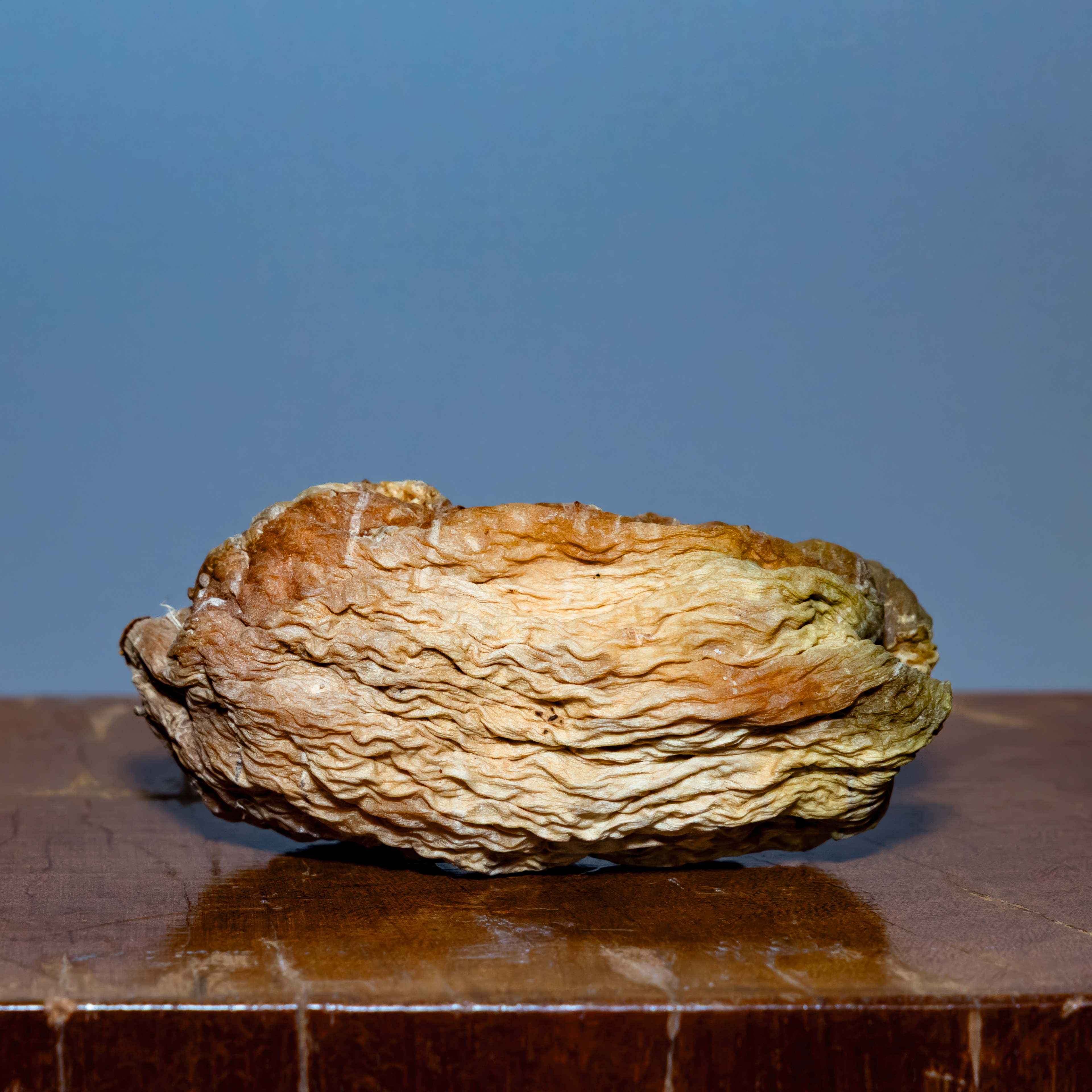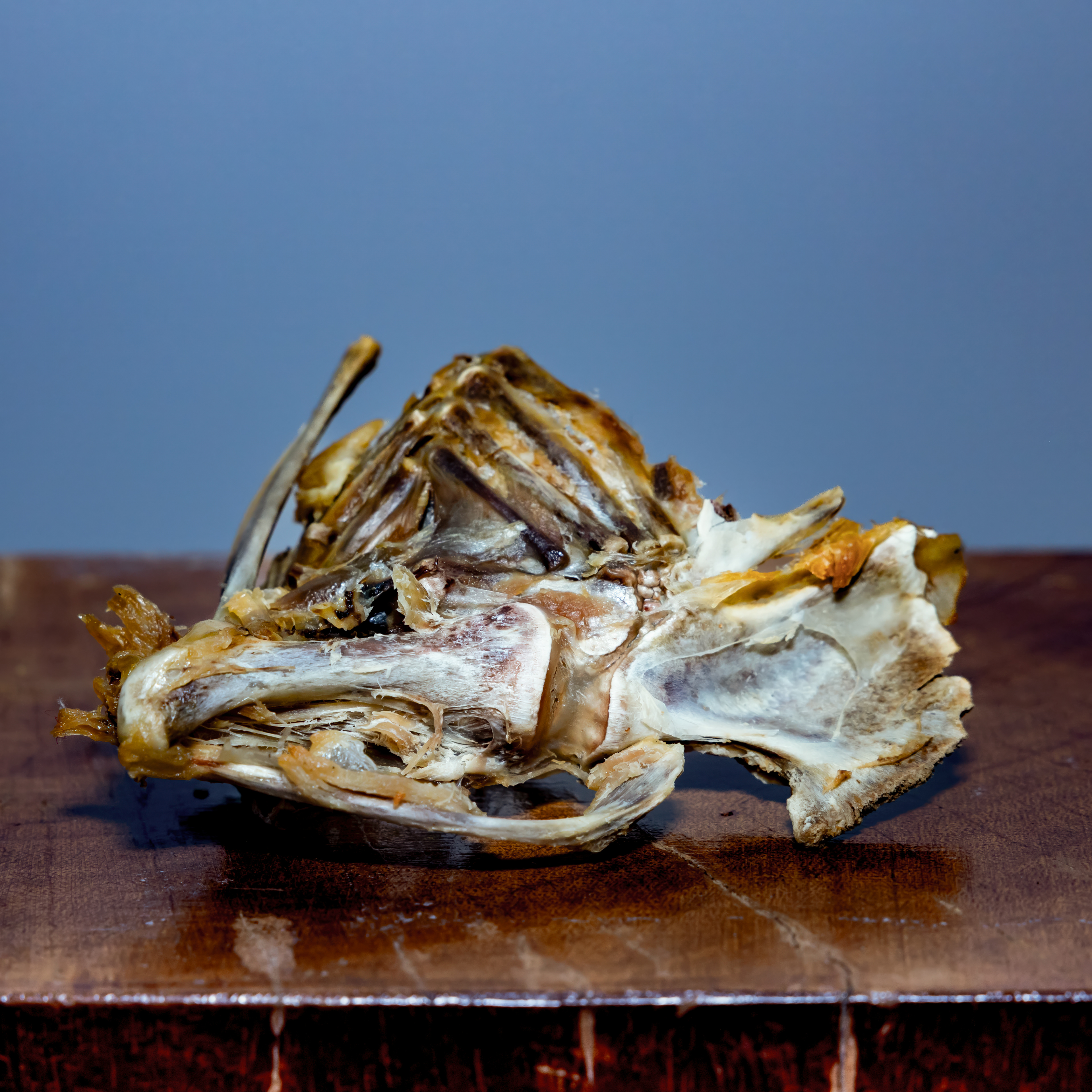 Foods that were once vivid surrender to time: a chicken carcass, a shrivelled radish, a browning perilla leaf, a sprouted garlic bulb. Their shrivelling is not decay but testimony — evidence of a life lived at the pace of distraction, use, and the passing of time.